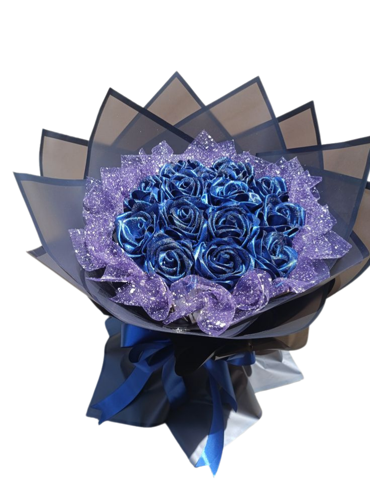 Rayakan momen istimewa dengan Romantic Bouquet berisi mawar satin biru elegan yang disusun anggun, dikelilingi mesh ungu berkilau yang menambah efek sparkling. Wrapping luar berupa lapisan hitam semi transparan dengan pola geometris menghadirkan kesan modern dan mewah. Buket ini disempurnakan dengan pita satin biru hitam di bagian dasar, menjadikannya pilihan unik untuk hadiah romantis, anniversary, maupun perayaan spesial.