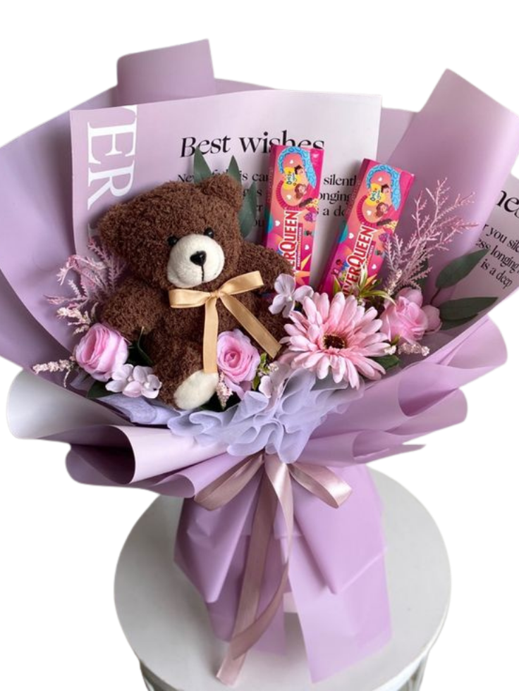 Custom Bouquet dengan teddy bear, cokelat Silver Queen, dan bunga artificial pink dalam wrapping lavender elegan.